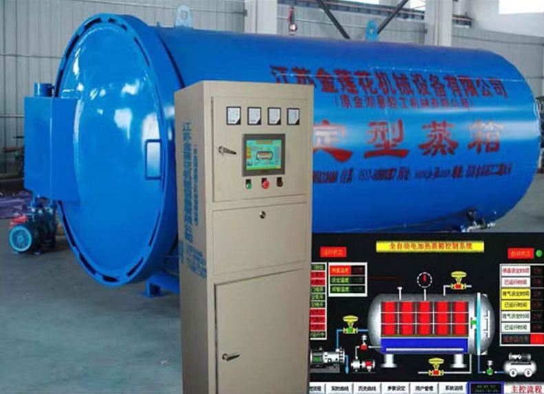 7立方DJRKSZX真空定型電加熱蒸箱由蒸箱主體、電腦控制柜、真空泵、內(nèi)外裝絲小車等組成。產(chǎn)品外觀尺寸為4300*2050*1850,重約3.4噸,總功率為50KW。在使用時(shí),產(chǎn)品進(jìn)入筒體后,程序?yàn)?封門—進(jìn)水—抽真空—加熱30分左右—保溫50分鐘(中途間隔加熱2次,每次3分鐘左右)--排汽—抽真空—進(jìn)大氣—結(jié)束全過程。因?yàn)樗谡婵諣顟B(tài)下70°C就會(huì)產(chǎn)生蒸汽,形成一個(gè)很強(qiáng)的浴面,這樣達(dá)到快速定型的效果。本產(chǎn)品的電加熱系統(tǒng) 由1組40KW或2組20KW的加熱系統(tǒng)組成,開始工作時(shí)達(dá)40KW,約20分鐘后,陸續(xù)產(chǎn)生蒸汽。約30分鐘,待蒸汽源滿足工作需要時(shí),電加熱系統(tǒng)陸續(xù)自動(dòng)停止工作,定型產(chǎn)品進(jìn)入保溫狀態(tài),約30分鐘,當(dāng)蒸箱內(nèi)需要蒸汽時(shí),系統(tǒng)又自動(dòng)恢復(fù)工作約3分鐘。 蒸一箱產(chǎn)品,大約需要80分鐘、電加熱系統(tǒng)工作約36分鐘,耗電24度。以后每蒸一箱產(chǎn)品,耗電約20度。每次可定型產(chǎn)品0.8噸,日定型產(chǎn)量約20噸,需操作工2人,日耗用水0.80噸。定型每噸產(chǎn)品成本不足30元。整個(gè)操作過程由電腦控制柜的控制系統(tǒng)自動(dòng)控制,定型效果好,適用于多種不同產(chǎn)品的定型。操作簡單,使用方便,節(jié)能環(huán)保,運(yùn)行安全可靠。